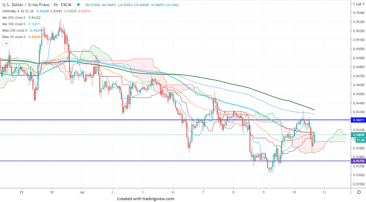In the 4-hour chart, the pair is holding well below 55 EMA at 0.9430 and any violation above 0.9430 will take the pair to next level till 0.9470/0.9535.