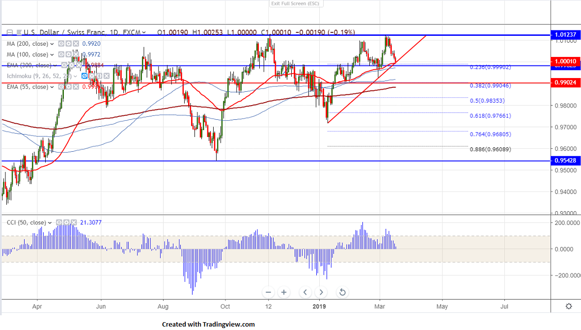 USDCHF continues to trade lower for 6th consecutive day and hits fresh 10 day low around 1.00107.The pair has formed temporary top around 1.01242 on Mar 7th 2019. The decline was mainly due to broad based selling in US dollar. US dollar index has lost more than 100 pips after hitting high of 97.71 almost a double top. Markets eye US FOMC policy meeting on Wed for further direction.It is currently trading around 1.00135.