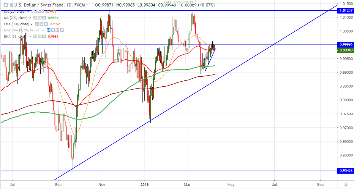 USDCHF is trading in narrow range between 1.00122 and 0.99779 for past three days.US dollar is trading lower against all majors on broad based dollar selling.The easing US and China trade tensions has decreased demand for safe haven such as yen and Swiss franc. The easing US-China trade tension has decreased the demand for safe haven assets like Gold, yen etc. Markets eye EU Brexit summit to be happened tomorrow for further direction.US 10 bond yield has shown a good jump of more than 8% from 14 month low of 2.34%.