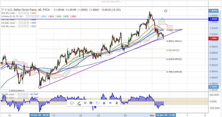 USDCHF has lost nearly 100 pips from the temporary top 1.00949 made on Oct 31st 2018. It hits low of 1.00004 and is trading around 1.00055.