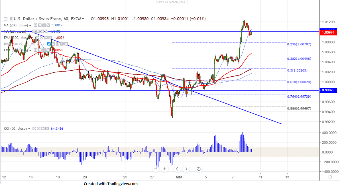 USDCHF was trading higher and jumped more than 80 pips on broad based US dollar buying. It has broken major resistance around 1.0100 and jumped till 1.01242 yesterday. USD dollar was trading higher against all major especially euro after ECB trims growth forecast. DXY shown a major jump and hits high of 97.71.