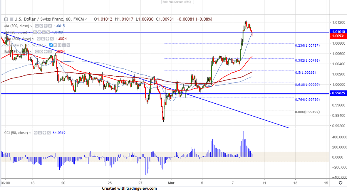 USDCHF was trading higher and jumped more than 80 pips on broad based US dollar buying. It has broken major resistance around 1.0100 and jumped till 1.01242 yesterday. USD dollar was trading higher against all major especially euro after ECB trims growth forecast. DXY shown a major jump and hits high of 97.71.