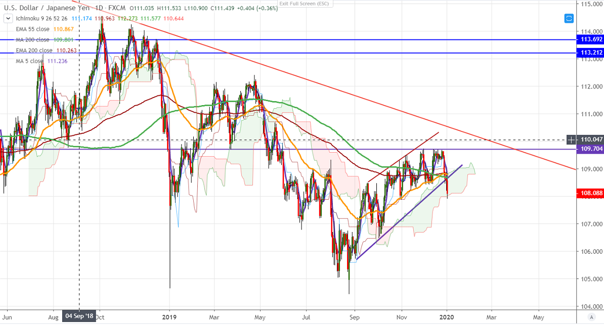 USDJPY trades weak and lost more than 80 pips from yesterday's high on an escalation of US-Iran tension. The US on Friday attacked Baghdad airport and Iranian Gen Qassem Soleimani killed. This increased demand for Safe-haven assets like yen, gold. It hits a low of 107.91 at the time of writing and is currently trading around 108.07.
