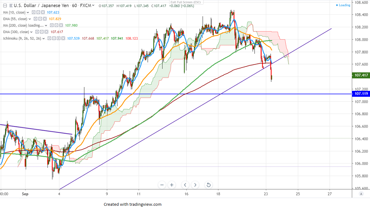 USDJPY is trading lower and lost more than 50 pips on account of geopolitical tension in the Middle East. The pair has formed a temporary top around 108.49 and started to decline. It is currently trading around 107.415.