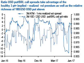 A new round of political uncertainty brought about by corruption charges against President Temer caused BRL to plunge and 1M ATM vols to jump this week. Our Latin economists do not view this as a game changer: despite the additional increase in uncertainty in the scenario of a Supreme Court, they still believe that the likelihood of President Temer remaining in office until the end of 2018 is higher than not at this as he probably has enough votes in the Lower House to block the charges.