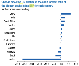 HFs manage to deliver positive alpha in 2016, for the first time since 2013. But to proxy the shifts in investor positions across equity indices we look at the change in the short interest of the biggest equity index ETF for each country. These ETFs are typically domiciled in the US. To proxy the shifts in investor positions across currencies we look at the change in the net spec position of each currency’s futures contracts as reported by CFTC. The changes in these position metrics since the US election are shown in above figures.