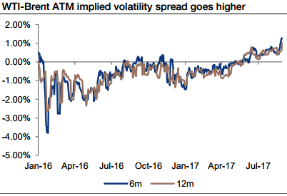 Amid ambiguity about the lasting damage of the hurricane is lifted, tactical investors could be drawn to selling long-dated (>6m) WTI ATM implied volatility and buying Brent ATM implied volatility. Courtesy: Societe Generale