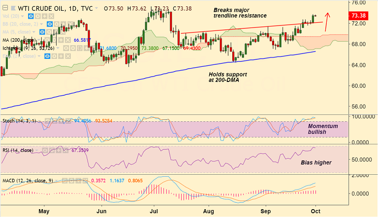 - Price action has bounced off 200-DMA and has broken above major trendline resistance at 72.25.