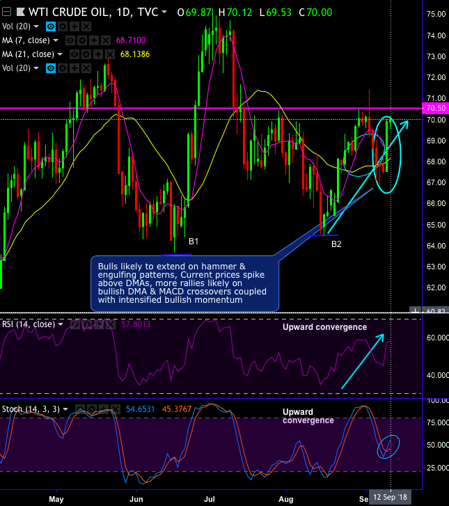 For now, the bulls most likely to drag the upswings upto next stiff resistance at $70.50 levels upon these bullish patterns as the current prices spike above DMAs with bullish DMA & MACD crossovers coupled with intensified bullish momentum.
