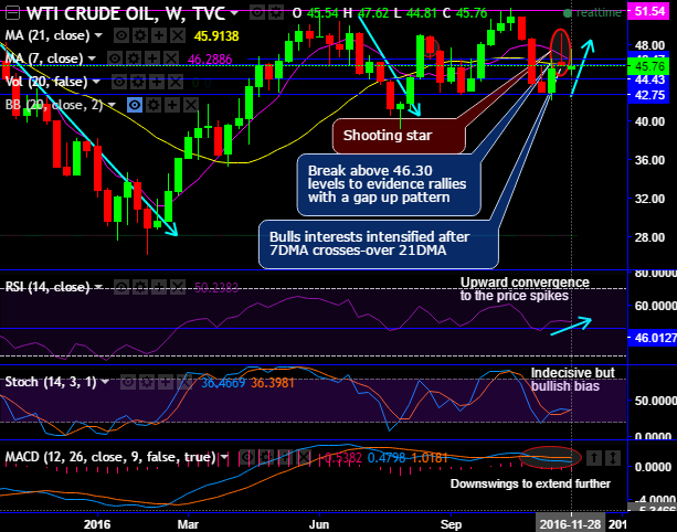 MACD signals the downswings to extend further on the pressure lingering around this energy commodity owing OPEC meeting. Asian energy stocks came under deep distress as the traders watching a meeting between the world's top oil producers in Vienna seen as crucial in supporting prices through output cuts.
