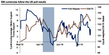 EMFX Trump-vulnerability index analyses five considerable factors (trade, security, local reaction, sentiment, and the US rates) to identify which EM currencies might suffer the most in the event of a Trump victory. The MXN, TRY, KRW, and TWD feature at the top of these rankings, while the ZAR and MYR show a strong historical relationship to polling data.