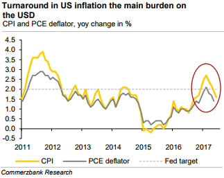 Market participants hope that robust euro-area growth will enable the ECB to turn away from the ultra-expansionary emergency monetary policy it pursued during the crisis years, and they doubt that the Fed will soon hike the Fed funds rate further against the background of recently disappointing inflation (refer above chart).