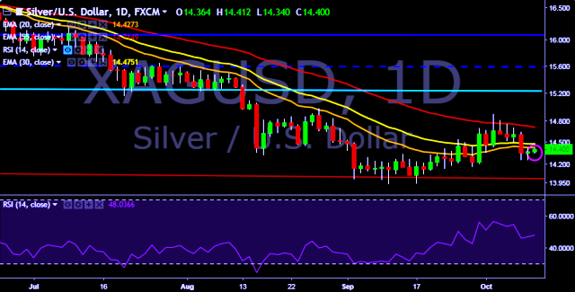 We prefer to take long position on XAG/USD only above $14.42, stop loss $14.30 and target of $14.58.