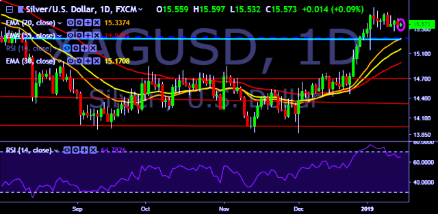 We prefer to take long position on XAG/USD around $15.58, stop loss $15.47 and target of $15.80.