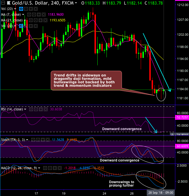 Technically, on intraday plotting Gold (XAUUSD price) formed “dragonfly doji” at $1,183.33 levels, consequently, bulls, for the day, have been attempting to break-out above 7-DMAs with considerable price upswings, but mild bull-swings are not backed by both trend & momentum indicators (refer 4H chart).