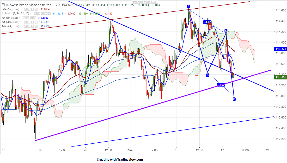 CHF/JPY was trading lower for past five working days. The pair has lost nearly 140 pips from the high of 114.63 made on Dec 11th 2018. It hits low of 113.25 and is currently trading around 113.32.
