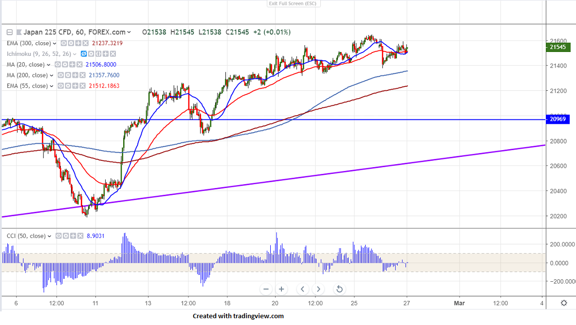 On the lower side, near term support is around 21350 (200-H MA) and any break below targets 21235 (300- H EMA)/21000/20800.The index should break below 20800 for further direction.