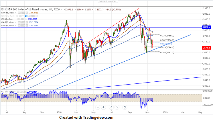 S&P500 is trading weak for 2nd consecutive days and lost more than 2.5% from high of 2747. It hits low of 2670 and is currently trading around 2670. The index is facing major trend line support at 2655 and any further break below confirms bearish continuation. S&P500 has formed temporary bottom at 2603 and shown a more than 8% till 2818.