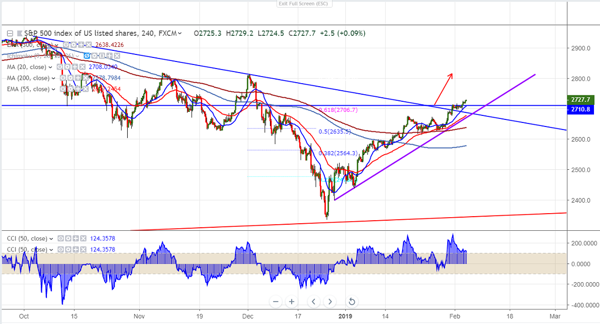 S&P500 continues to trade higher in Feb after 7.9% jump in the month of Jan best month since 1989. The index jump was mainly due to better corporate earnings by tech companies and dovish Fed.US Fed was more dovish and pledges ‘patience’ stance for further moves .Alphabet inc has posted better than expected results yesterday with net income at $8.95 billion compared with losses of $3.02 billion.But increasing advertising costs and declining margins is putting pressure on the stock price. The index hits high of 2729 and is currently trading around 2728.