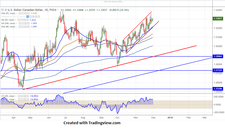 USDCAD has shown a good recovery after more than 100 pips decline.Loonie was trading higher nearly 2-month and jumped more than 500 pips from low of 1.28125 made on Oct 1st 2018. The jump was mainly due to the huge sell-off in crude oil price. Markets eye Canada GDP data and Trump and XI meeting for further direction. Loonie recovered till 1.33123 and is currently trading around 1.33055.