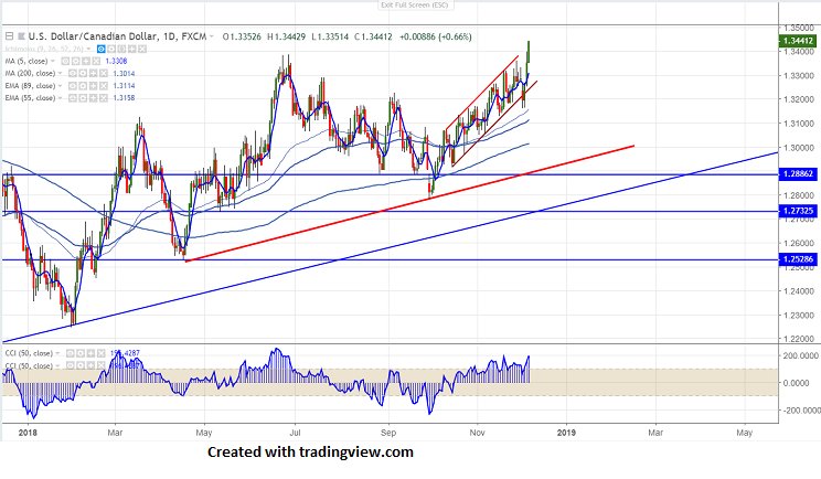 USD/CAD shown a massive recovery of more than 150 pips from low of 1.32527 in past two trading session on dovish Bank of Canada policy. BOC has kept rate unchanged at 1.75% and said that economy is losing momentum and decline in crude oil prices affecting energy sector. Alberta’s decision to cut oil production will have impact on Canadian economy. According to Bank of Montreal economists predicted on Monday that GDP would expand by 1.8% instead of 2%. The pair jumped till 1.34387 and currently trading around 1.34367.