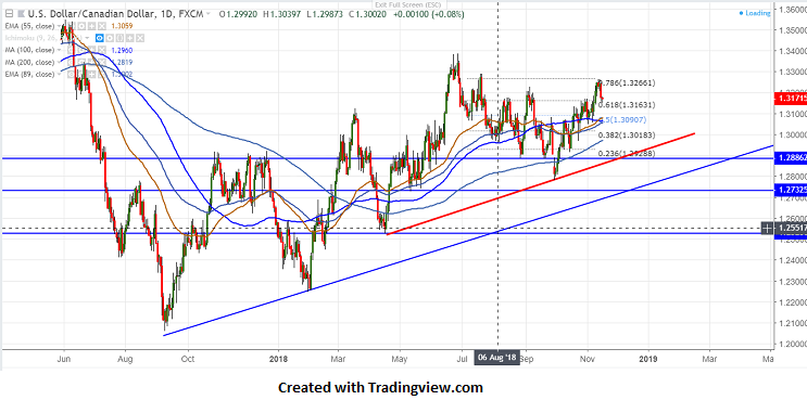 USDCAD has halted its bullish trend after massive 450 pips jump from low of 1.2780 made on Oct 1st 2018. The Canadian dollar was trading weak and hits 4 -month low on account of huge plunge in crude oil prices. The pair hits high of 1.32636 and shown a 100 pips decline from that level. It is currently trading around 1.31680.
