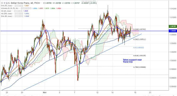 The policy divergence between US Fed and SNB is also supporting USDCHF prices. The pair was trading slightly below 200 H MA and not able to hold below that level for a long time. Technically , near term support is around 1.0020 (20- day MA) and any violation below targets 1.000/0.9950. Short term weakness below 0.9950 level.