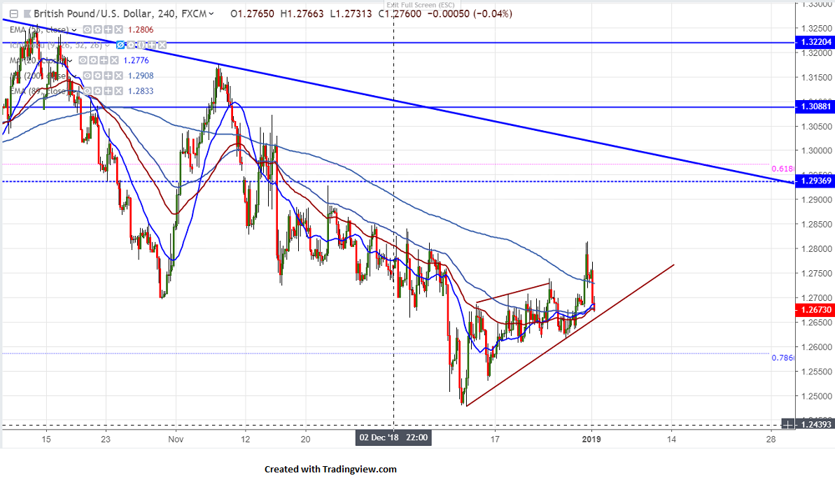 The pair has recovered more than 300 pips from the low of 1.24800on account of broad based US dollar selling , dovish Fed and partial US government shutdown. The parliament debate on the UK PM Brexit agreement is expected to happen on Jan 7th 2019 and voting is set to take place before Jan 21st 2019.