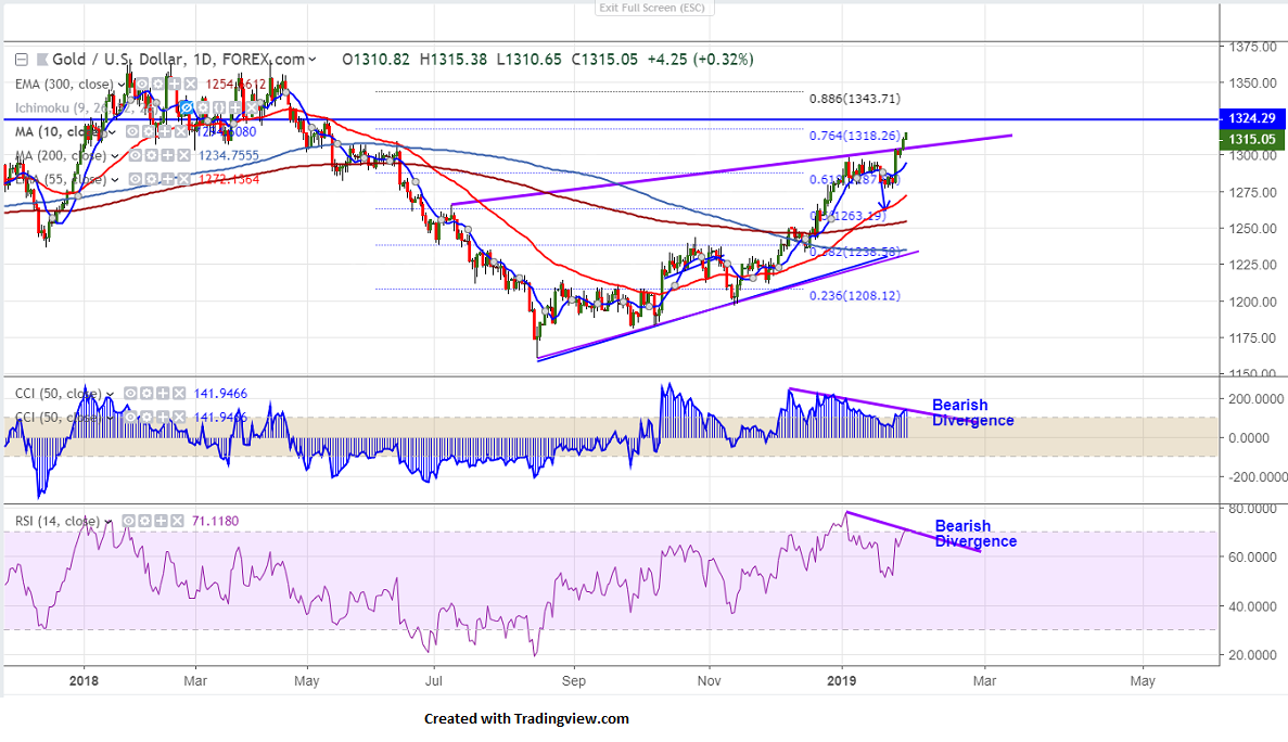 The near term support is around $1300 and any violation below will drag the commodity down till $1294/$1291 (10- day MA)/$1280.Any break below $1276 confirms minor weakness.