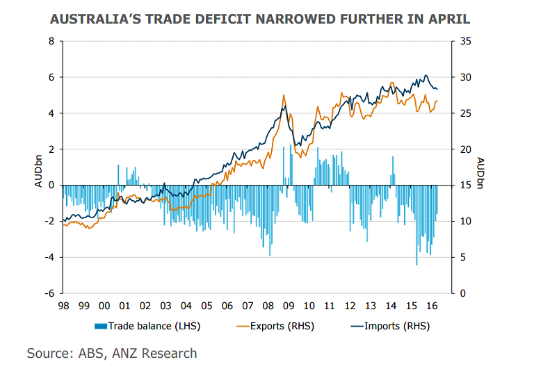 The data publications over the past few have been upbeat and suggest that the RBA is unlikely to see further need for adjustments. Growth in Q1 was solid at +1.1% q/q, the trade balance for May also looks better. Australia's trade deficit narrowed substantially in April, to AUD1.6bn from a downwardly revised AUD2.0bn in March. The sharp improvement suggests net exports will make a solid contribution to Q2 GDP.