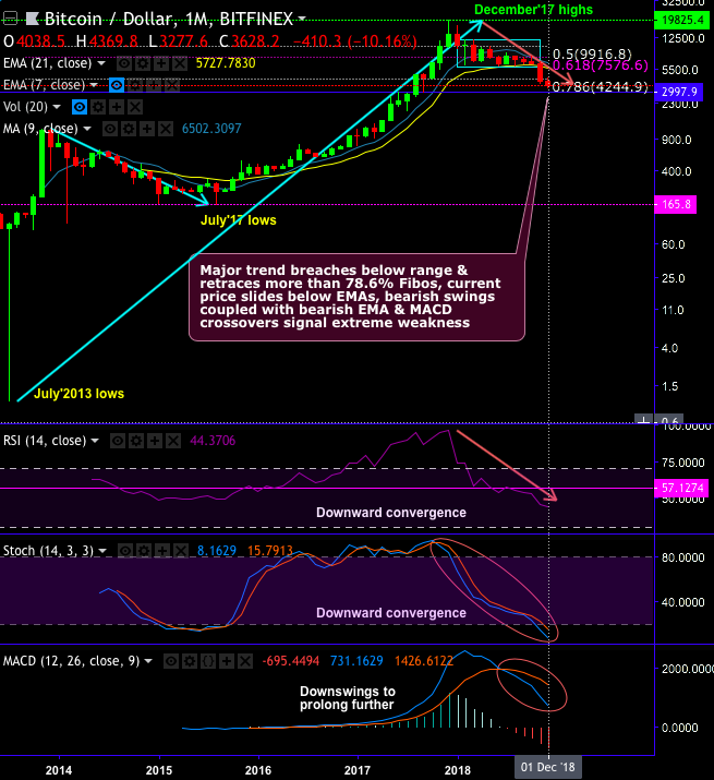 BTCUSD price dropped to $3630.20 -0.33%, showed a new yearly low last week at $3,277.60 and the overall market cap now rests at $110.6 Billion. Evidently, bears are still running the show for BTC and the SEC’s final postponement of a Bitcoin exchange-traded fund decision didn’t seem to help. Technically, the major trend of this pair breaches below range (as shown in the diagram) and retraces more than 78.6% Fibonacci levels, the current price slides below EMAs, bearish swings coupled with bearish EMA & MACD crossovers signal extreme weakness.
