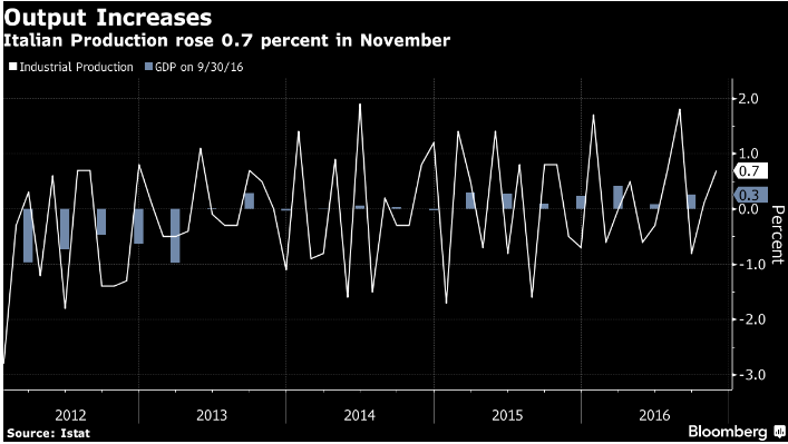 Better-than-expected rise in Italian industrial production in November suggests a possible acceleration in economic activity. Separately, Istat reported last month Italy's manufacturing confidence index rose in December to the highest in a year. Istat’s leading indicator signalled an extension of Italy’s recovery with “a positive prospect of the economic growth pace in the next months,” the statistics agency said in a December 30 report.