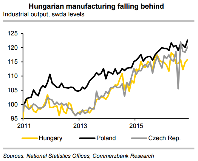 "We do not anticipate noticeable pick-up in coming months, and as a result estimate slower 1.3% growth for 2017. This is why we expect MNB's monetary stance to remain more accommodative than those of NBP or CNB. We expect EUR-HUF to move up towards 315.00 over the coming quarter." said Commerzbank in a report.