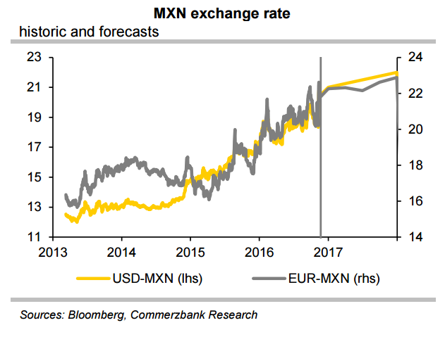 "We expect another 50bp rate hike for December. We expect the peso to depreciate to 22 against the USD over the course of next year," said Commerzbank in a report.