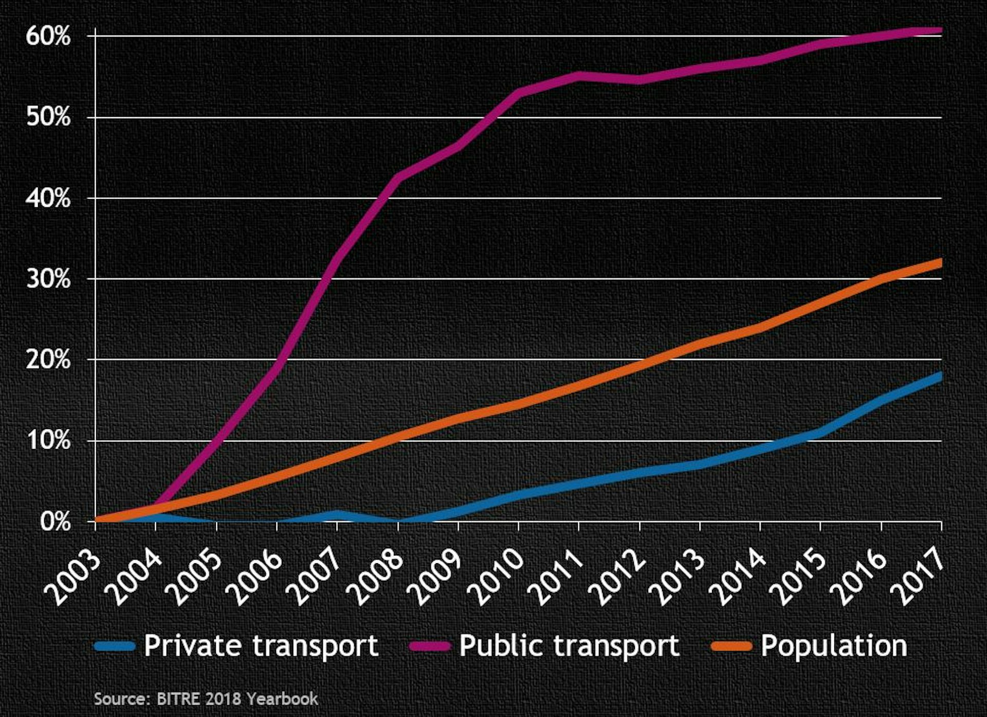 Across Melbourne since 2003, the growth in public transport use has been around three times the growth in private transport use. Over this time the growth in car use has been slower than population growth.