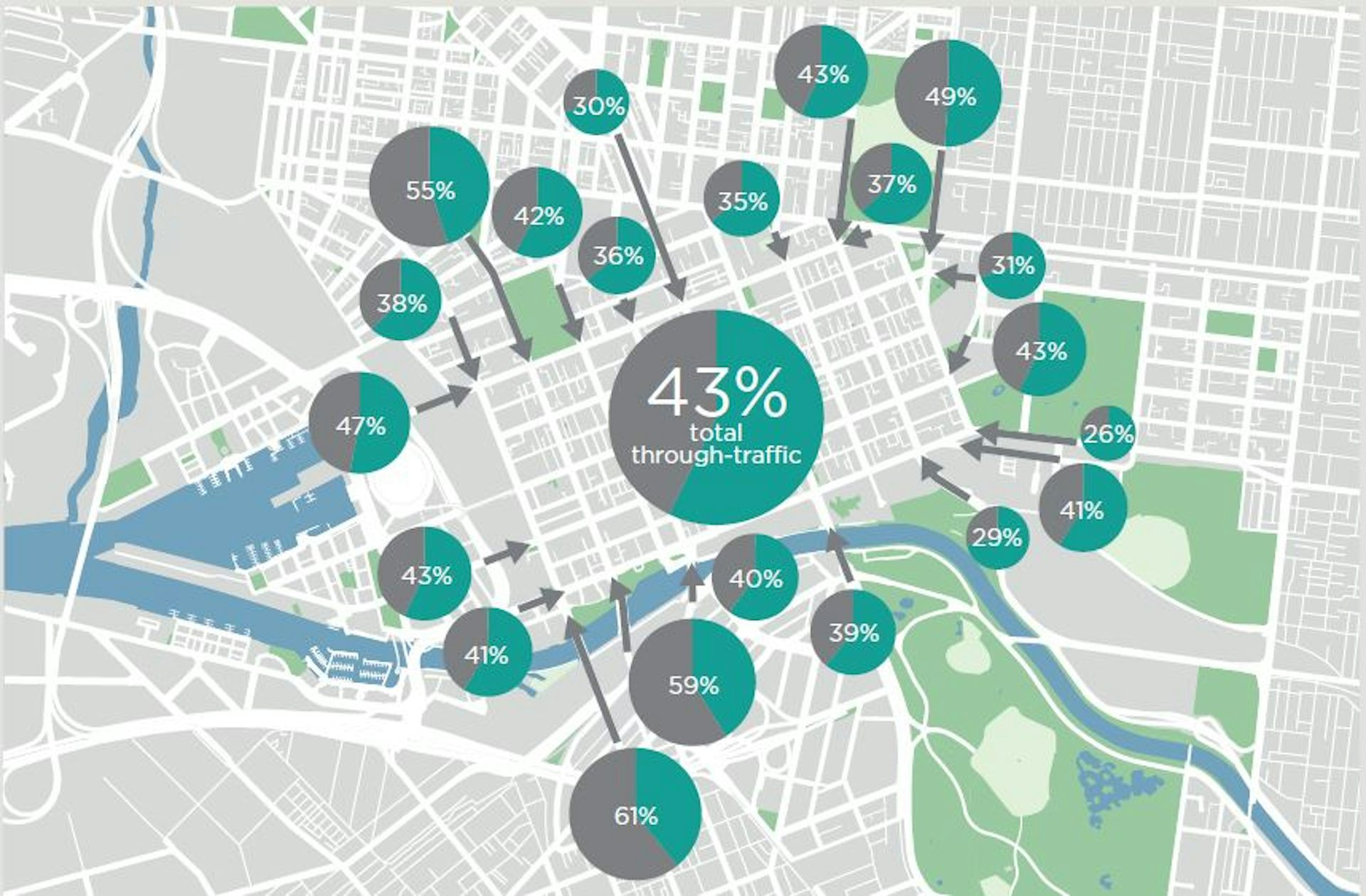 Proportion of through-traffic entering the Hoddle Grid at each entry point. City of Melbourne, Draft Transport Strategy 2030, page 53