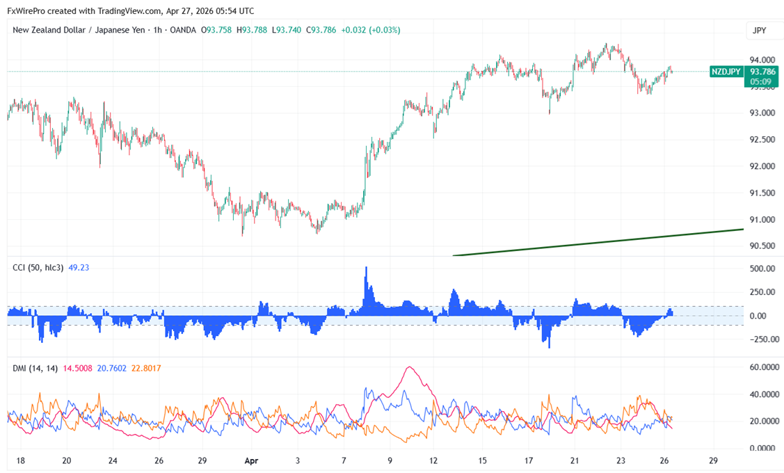 NZDJPY trades flat with positive bias. It reached an intraday high of 93.89 and is currently trading near 93.78. If the 92.80 support level stays steady, the upward trend seems to be going well.