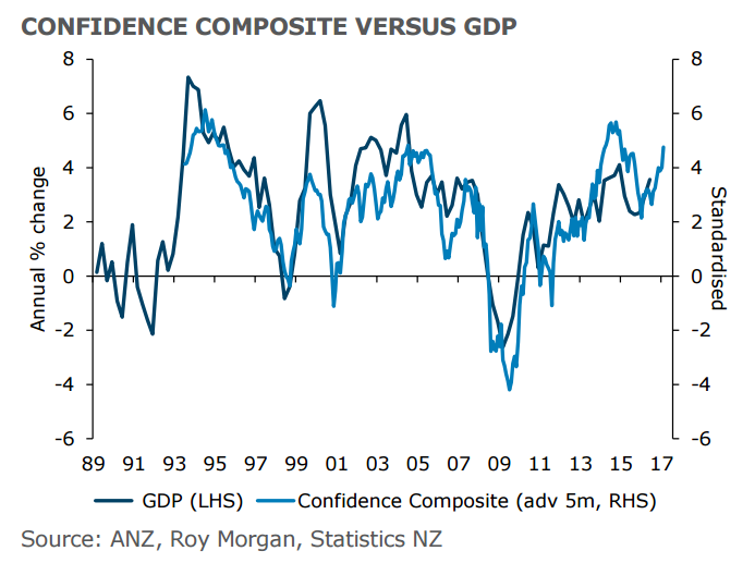 "The economy remains odds-on to put in another good year," ANZ Bank New Zealand chief economist Cameron Bagrie said in his report. "Our confidence composite indicator – which combines both business and consumer sentiment – is pointing to GDP growth accelerating from its current pace of 3.5 percent. The New Zealand economy remains a furlong out in front of most developed-nation peers." he added.