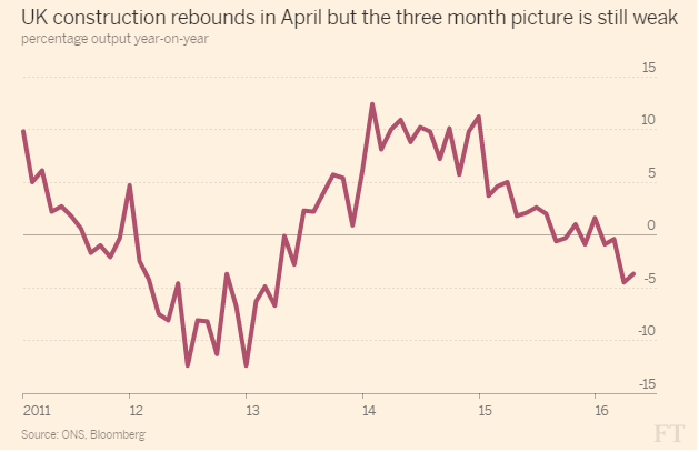 Data from the Office for National Statistics released on Friday showed UK construction output rising 2.5% in April, the biggest monthly increase since January 2014. The reading beat economists' expectations for a 1.7 percent increase and compared to a 3.6 percent dip in March. Given the sharp fall in construction output in Q1, and particularly the big decline in March, a sizeable rebound was expected in April.