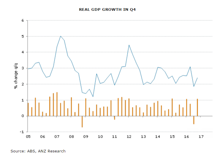 The RBA voted to keep monetary policy unchanged at the February meeting amid signs of improving inflation. The RBA noted that contraction in Q3 was due to “temporary factors,” such as disruptions to the coal supply and bad weather. Policymakers believe the economy is on course for a stronger recovery in 2017. However, cautious comments prevailed on the labor market. The RBA warned subdued growth in household income was likely to constrain consumption growth.