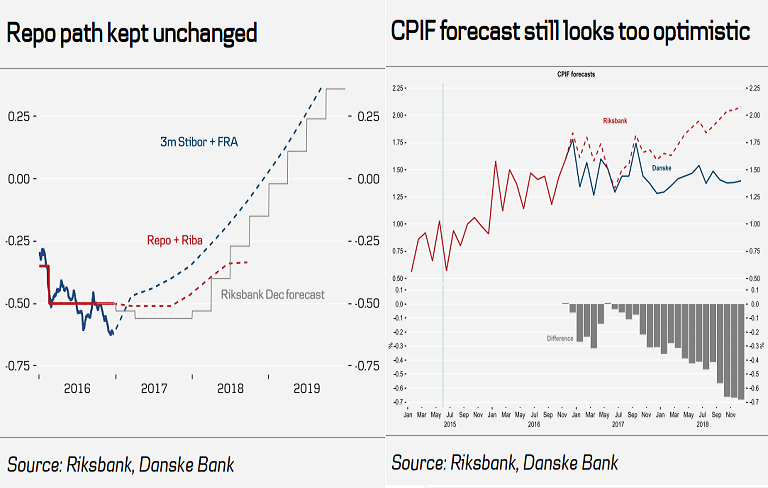 The Swedish central bank (Riksbank) kept its policy rate on hold at -0.5 percent at its policy meeting today and delivered SEK30bn in extended QE as expected (SEK15bn nominal and SEK15bn linkers) running to mid-2017. The repo rate path was kept unchanged and therefore still has a short-term easing bias.