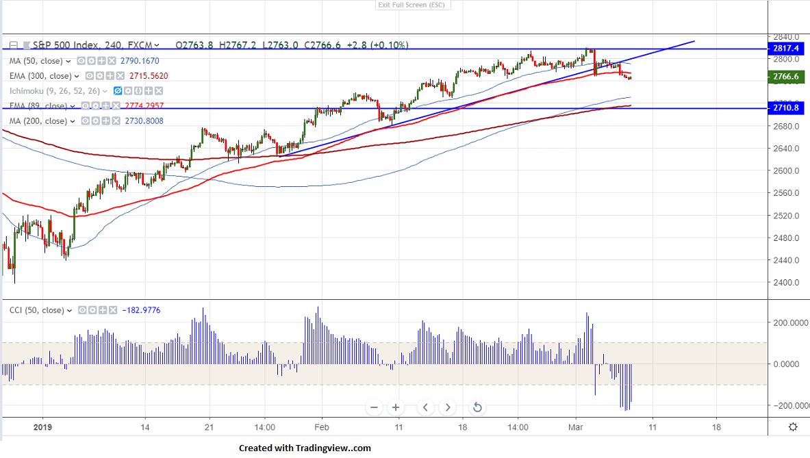 S&P500 trades weak for past three trading day after a continues jump for past more than 2- month. The index recovered more than 20% from low of 2334 level on account of easing trade tensions between US-China. It has formed temporary top around 2820 and is currently trading around 2765.40