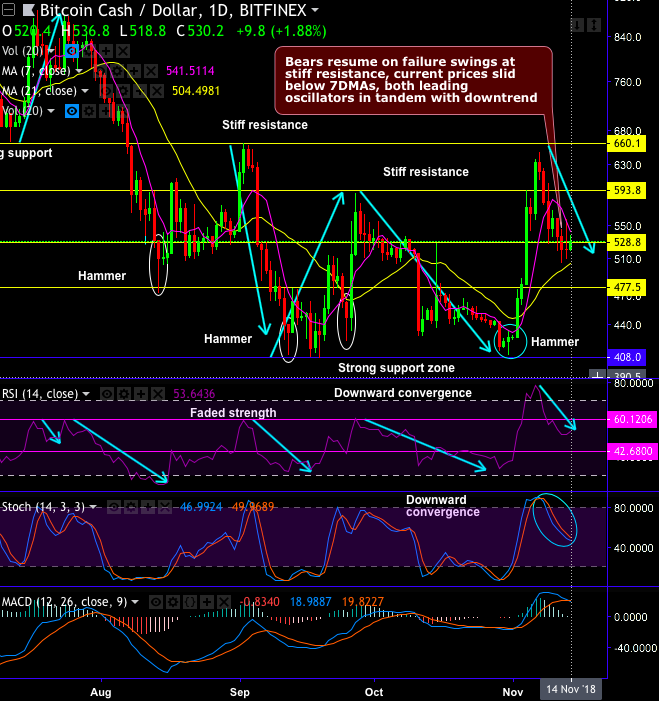 The BCH price sentiment in the intermediate phase: The consolidation phase in the current intermediate trend attempts to spike above 7EMAs on hammer & engulfing patterns but restrained below 21EMAs (refer weekly plotting), more rallies possible only upon break-out above stiff resistance.