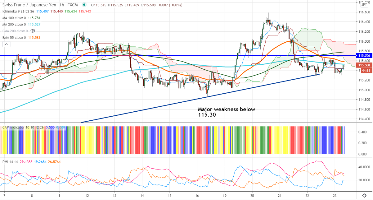 In the one hour chart, CHFJPY is trading below 100 and 200 MA. Any break below 115.23 will take the pair till 115/114.86. On the higher side, near term intraday resistance is around 115.60 and any indicative break above that level will take the pair till 115.95/116.20/116.60/117 likely.