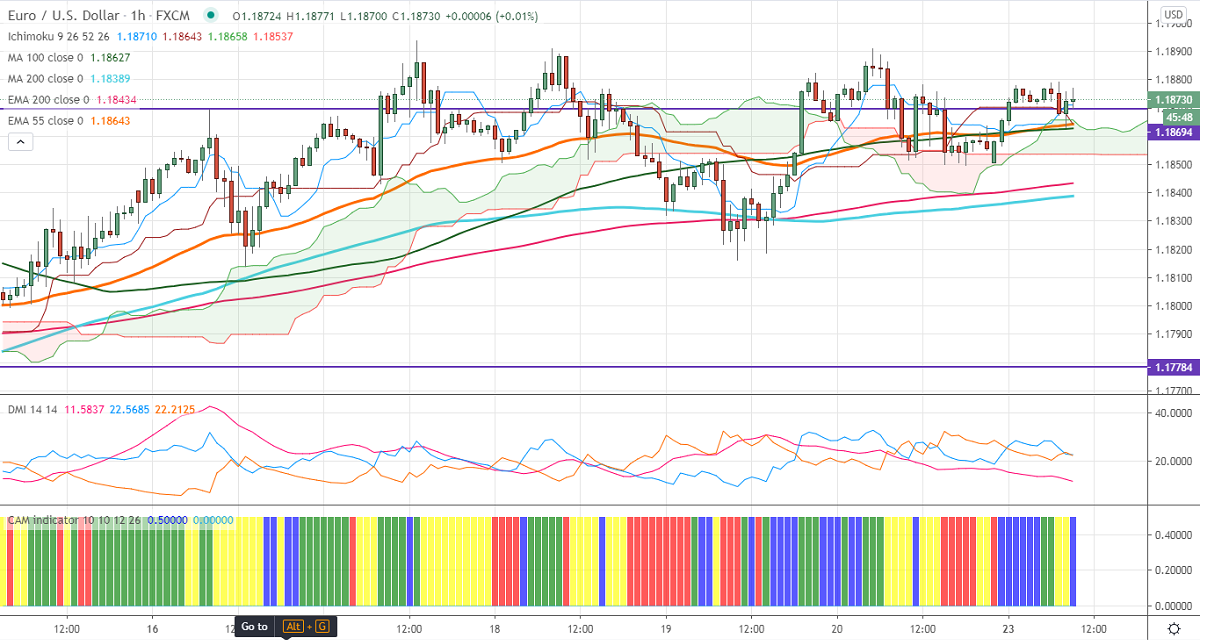 EURUSD is trading in a narrow range and struggling to break above the 1.1900 level. The German flash manufacturing and services PMI came better than expected. Eurozone flash manufacturing came at 53.6 vs an estimate of 53.2. The surge in the number of corona viruses in the US is supporting the US dollar index at lower levels. Short term trend of the pair is bullish as long as support 1.1800 holds.