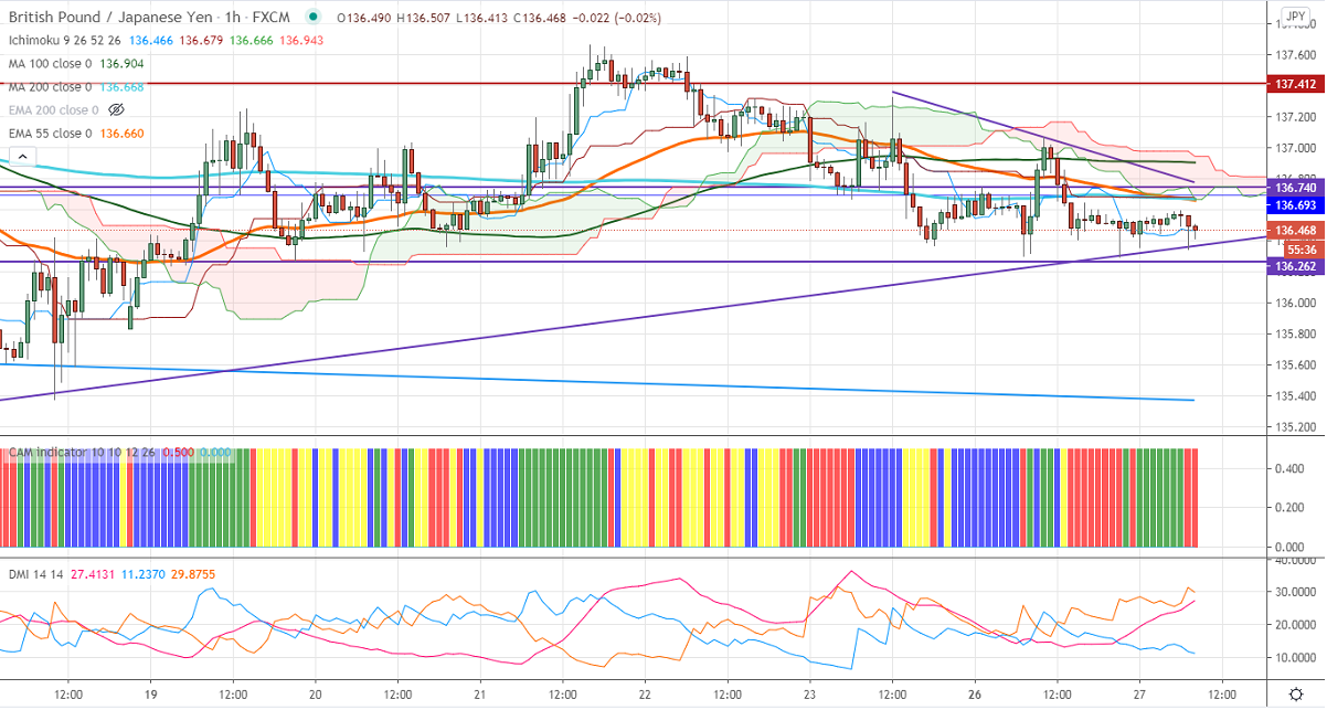 GBPJPY continues to trade weak after a minor jump to 137.06. The dip in Pound sterling due to Brexit uncertainty and rise in Coronavirus case. GBPUSD is facing strong support at 200-H MA at 1.3000 and any violation below that level targets 1.2940/1.2900. The short term trend of GBPJPY is slightly bearish as long as resistance 137.60 holds.