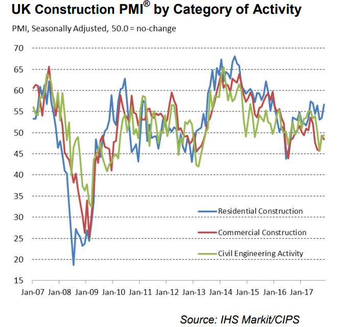 Residential work has been the main driver behind the modest construction rebound in November. The government’s Help-to-Buy equity loan program has supported demand, driving the robust and accelerated upturn in residential work. In contrast, commercial and civil engineering activity continue to decline. Commercial construction continued the trend seen for much of 2017 so far, while civil engineering activity fell for the third successive month.