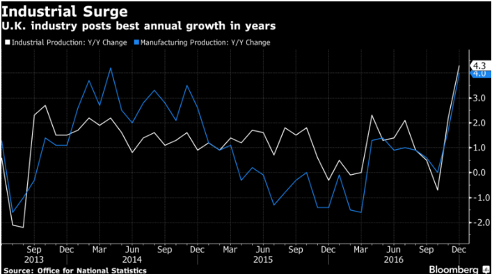 Data released by Office for National Statistics (ONS) showed Friday that U.K. industrial production growth exceeded economists' expectations in December. U.K.'s industrial output climbed 1.1 percent month-on-month in December while manufacturing output expanded 2.1 percent. On a yearly basis, industrial and manufacturing output gained 4.3 percent and 4 percent, respectively.