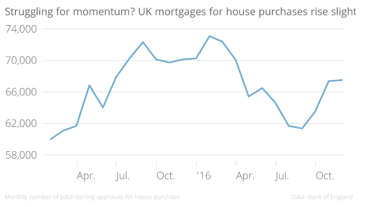The BoE forecast in November that mortgage approvals would slow to a monthly average of 65,000 over the next six months. Major lenders also expect weaker house price growth. Economists polled by Reuters expect U.K. economic growth to more than halve this year to a rate of 1.1 percent as inflation rises to close to 3 percent from less than 1 percent in 2016 due to the effect of sterling's sharp fall since June's Brexit vote.