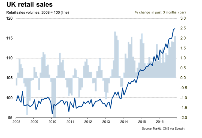 Details of the report suggested higher fuel and food prices were key factors contributing to the slowdown. Data is consistent with the message from various private sector surveys such as those of BRC and CBI, along with John Lewis sales that retail spending in the first few weeks of 2017 has been lacklustre. Analysts expect further slowing in consumer spending as rising inflation is set to further eat into real wages this year.